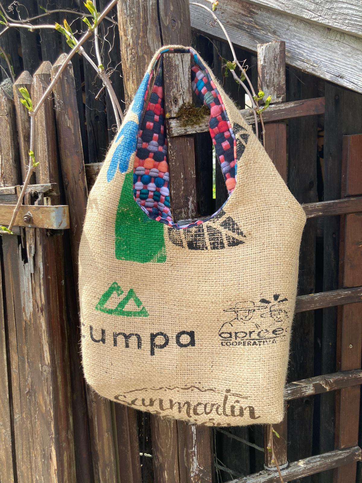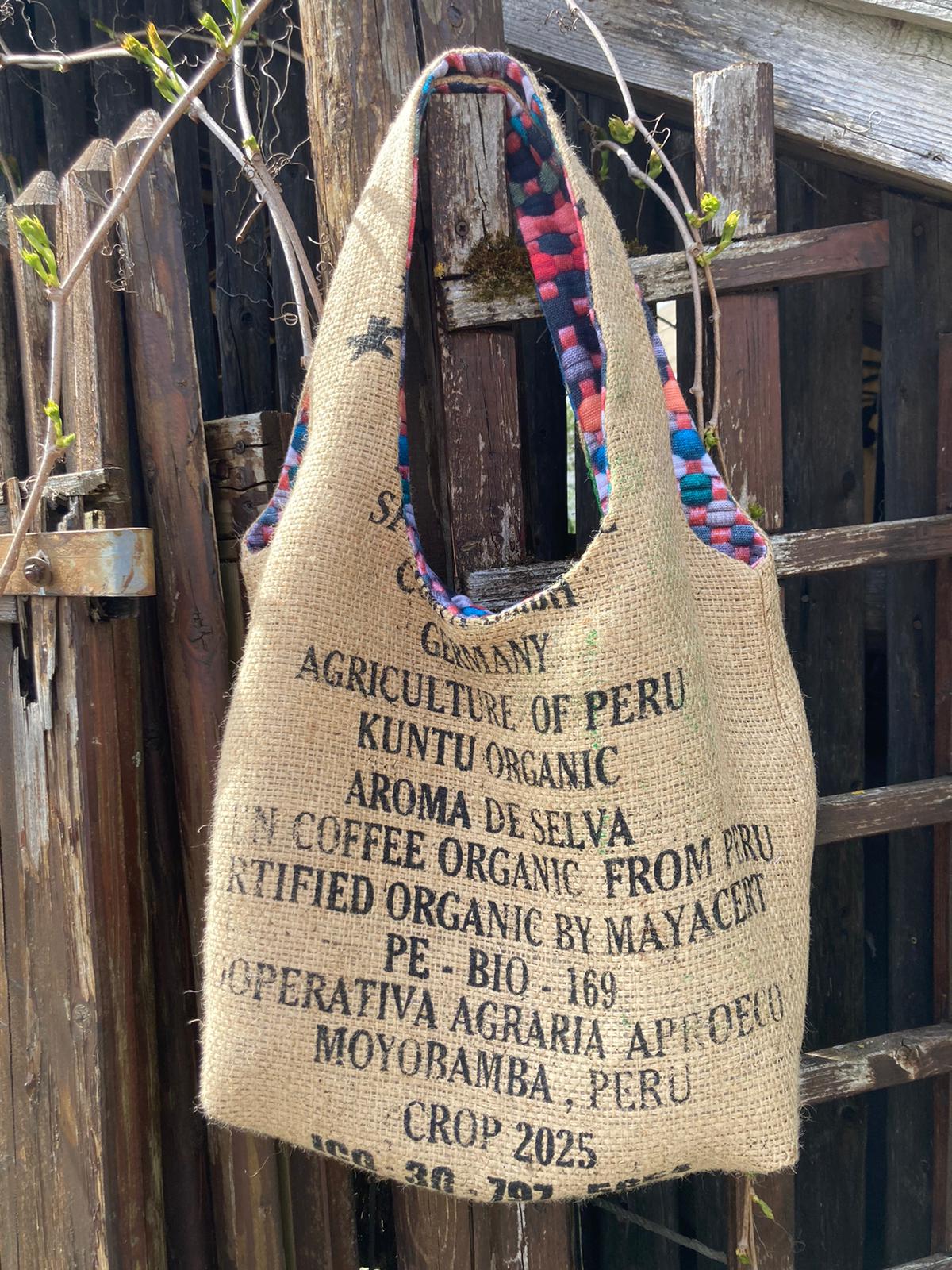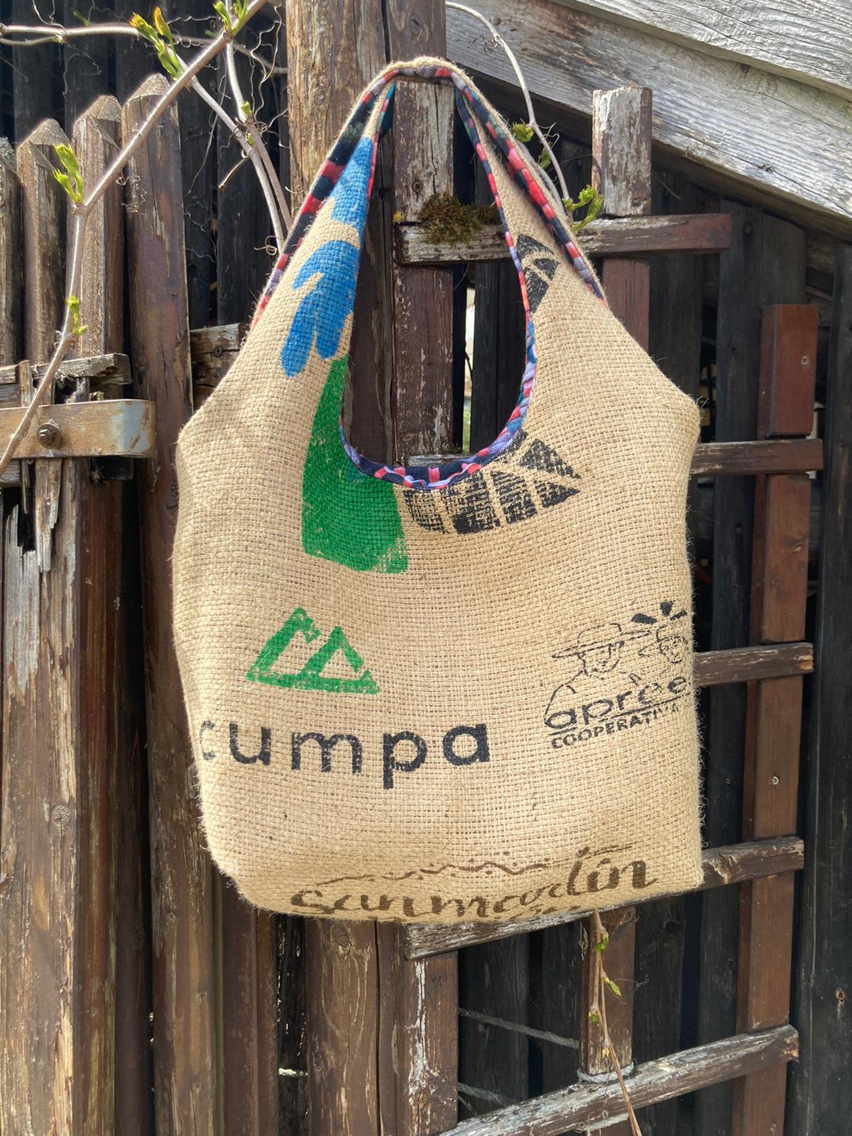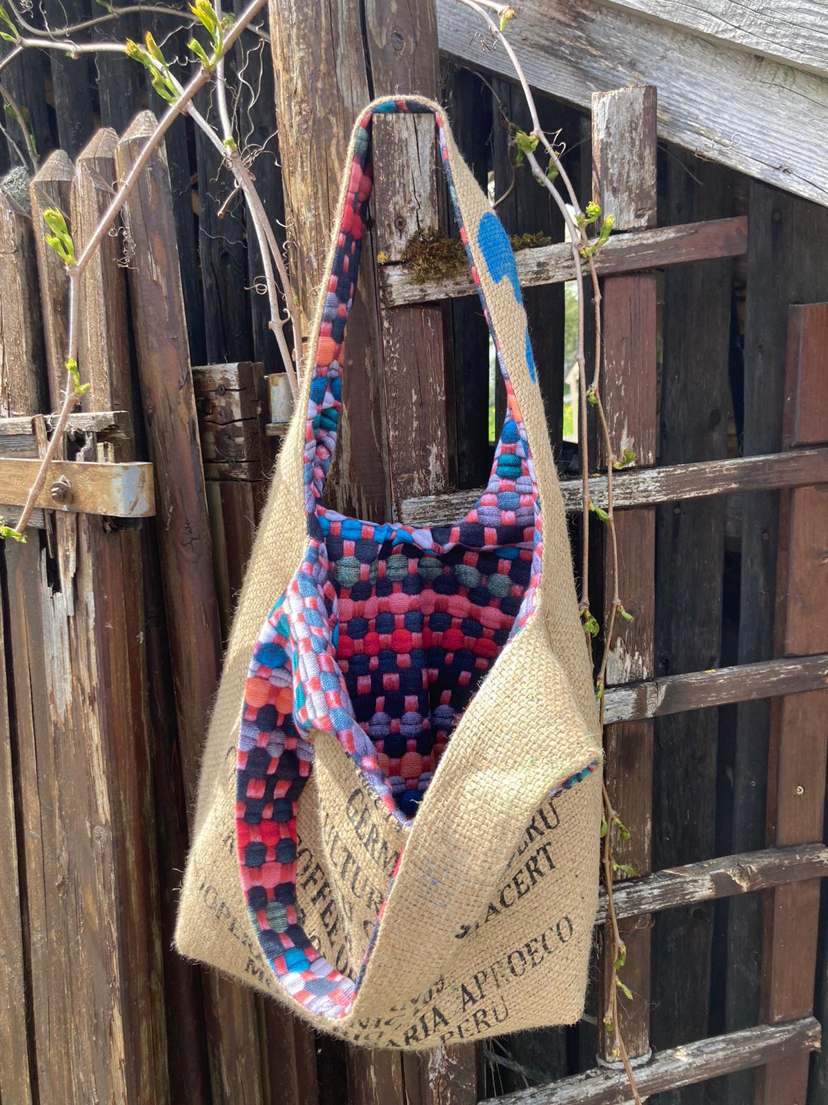 Diese Umhängetasche nähe ich aus einem Kaffeesack. Wie Du vielleicht weißt, werden Kaffeesäcke nur einmal gebraucht und werden dann weg geworfen. Ich bekomme meine Kaffeesäcke von einem befreundeten Kaffeeröster. Hier nun eine Tasche mit einem witzigen Innenstoff, der einen Flickerlteppich nachahmt.